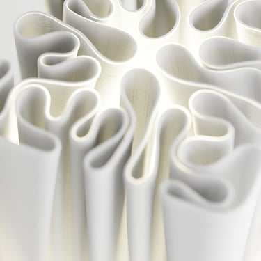 Starting from a precise geometric foundation, the surface gradually evolves into softly entwined vertical lines. These lines draw closer as they rise, flowing in harmony without ever touching. The result is a mesmerizing interplay between structure and softness — a form that feels both architectural and organic.
